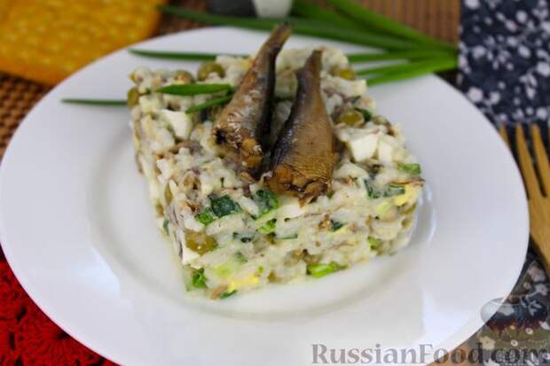 сардины консервированные, кукуруза консервированная, яйца, лук репчатый, зелень укропа, майонез, сольОдин из вариантов слоёного салата с консервированной рыбой, плавленным сыром и варёными яйцами. Лучше всего такие салаты выкладывать на тарелку слоями с помощью кулинарного кольца, тогда слоёный салат будет выгодно и очень торжественно смотреться на столе.